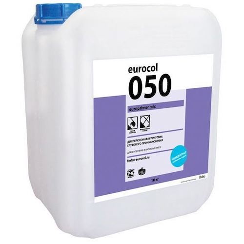 Грунтовка Forbo 050 Europrimer Mix / 10 кгДисперсионная грунтовка-концентрат, использующаяся для подготовки впитывающих влагу минеральных оснований. Данная грунтовка хорошо зарекомендовала себя при обработке пыльных, сыпящих песок полов на цементной основе, до начала шпатлевочных работ. Скрепляет между собой осыпающиеся частицы на отслаивающихся основаниях, укрепляет непрочные основания и повышает адгезионные свойства. Расход грунтовки зависит от области применения, разбавляется чистой водой в следующем соотношении для полов: 1:5, для стен 1:9. Есть несколько способов нанесения грунтовки: валиком, щеткой и при помощи распылителя. Разбавленная в надлежащем соотношении грунтовка должна максимально глубоко пропитывать обрабатываемое основание. Не допускается появление тонкой пленочной массы на основании, причиной образования такой пленки может служить недостаточный объем воды, образование данной пленки может стать причиной снижения сцепляющих свойств. Интервал времени для подсушки зависит от толщины слоя, температуры и влажности воздуха. Выравнивающие смеси на цементной основе можно применять приблизительно через 30 минут. Если требуется промежуточная обработка выравнивающих смесей при их многослойном нанесении, то концентрат Forbo 050 Europrimer Mix (10 кг) нужно разбавлять водой в соотношении 1:7 ! А предыдущий слой должен высохнуть. При повышенной впитываемости грунтовать следует в несколько слоев. На слабых осыпающихся основаниях грунтовочные работы следует производить в три слоя, при этом повышать концентрацию грунтовки следующим способом: при нанесении первого слоя 1:9, второго слоя 1:1 и третьего слоя 1:5. В данном случае время полного высыхания составит около 3-6 часов! ТЕХНИЧЕСКИЕ ХАРАКТЕРИСТИКИ