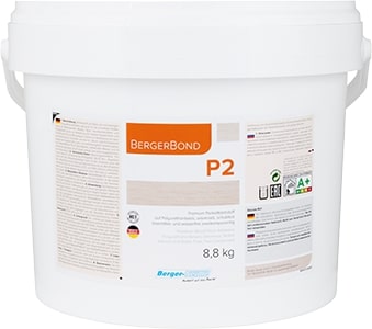 Клей Berger Bond P2X / 10 кгBerger Bond P2X – это клеевой состав из двух компонентов на основе полиуретана экстра-класса. Предназначен для укладки деревянных покрытий различных типов к основанию из фанеры или бетона. Им можно склеить фанеру с бетоном, даже без дюбелей. У этого клея, лучшее соотношение цена-качество, в линейке адгезивов Berger-Seidle. Характеристики продукта: ИЗГОТОВИТЕЛЬ: Berger-Seidle; ТИП КЛЕЯ: двухкомпонентный; ПЕРИОД ПОДГОТОВКИ КЛЕЯ ДЛЯ ШЛИФОВАНИЯ: 24 часа; СРОК ГОДНОСТИ: 1 год; ПЕРИОД ЭКСПЛУАТАЦИИ В ОТКРЫТОЙ ФАЗЕ: от 30 до 40 минут; РАБОЧИЙ ИНВЕНТАРЬ: зубчатый шпатель; РАСХОД МАТЕРИАЛА: примерно 1,2 кг/м2 для паркета, и 1,3 кг/м2 для фанеры. УПАКОВКА: основа 9 кг и 2-ой компонент 1 кг. Обзор. Клеевая основа состоящая из двух компонентов сделанная из первосортного сырья, необходима затем, чтобы крепко приклеивать паркетную мозаику, многослойные паркетные доски, ламинированный, индустриальный, штучный паркет. Подойдет для приклейки множества редких древесных пород и торцового паркета категории RE. Идеально приклеивает даже неустойчивые к влажности породы дерева, к примеру, клён бук или ясень, они не деформируются и не разбухают. Клей Berger Bond P2X не имеет в составе воду и растворители, и способен сдерживать не только вес обычной мебели, но и более высокую нагрузку (специализированная мебель на роликах для офиса). Более долгая открытая фаза. Основные эксплуатационные качества: