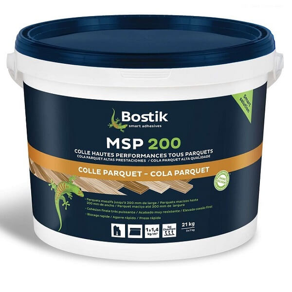 Клей Bostik MSP 200 наносится зубчатым шпателем на поверхность основания, из расчета 700-1000 г/м2. Время гуммирования отсутствует.Зазоры между стеной и паркетными плашками должны быть не менее 8 мм. Этот зазор в последствие заполняется герметиком и закрывается плинтусом. Правило расчета зазоров: 0,15% от каждого самого большого размера поверхности, покрываемой паркетом.