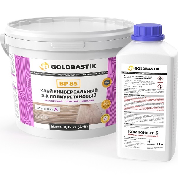Клей GOLDBASTIK 2-К полиуретановый BP 85Технические характеристикиТип клея - паркетный Основа клея - полиуретан, изоцианаты Количество компонентов - двухкомпонентный Условия отверждения - смешивание с отвердителем Общий вес комплекта - 9,35 кг Цвет - светло-коричневый Пригоден для склеивания - всех видов паркета и фанеры Морозостойкий - нет Срок годности - 1 год Расход - 1000-1300 грамм на кв.м. Виды фасовок - 9,35 и 4,75 кг |