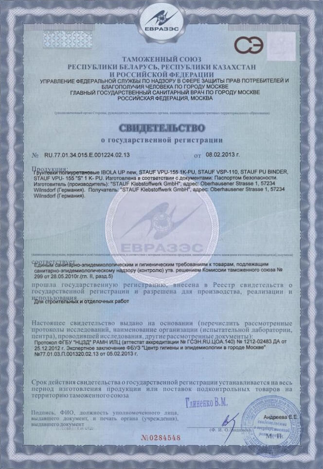 В качестве альтернативы можно нанести грунтовку валиком из поролона, щеткой или шпателем без зубцов. В течение 48 часов после нанесения грунтовки можно приклеивать покрытия, используя клеи STAUF PUK-, SPU- или SMP- без предварительного обсыпания песком.