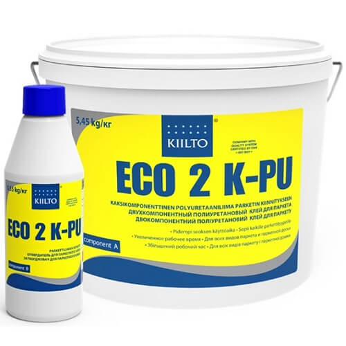 Клей KIILTO ECO 2K-PU / 6 кгКлей полиуретановый (2-компонентный) Kiilto ЭКО 2K PU.Стандартно применяется для работы с паркетом (вне зависимости от того, к какому виду он принадлежит) различного размера. Совет: Прежде чем применять его для сильно маслянистых древесных пород, следует выполнить так называемый пробный вариант склеивания. / Проследите за тем, чтобы облицовываемая поверхность была идеально чистой и сухой. Такое покрытие должно быть достаточно плотным и не иметь никаких бугристых выступов, а также несодержать пыли, остатков прежних покрытий и маслянистых разводов. Основание должно полностью соответствовать установленному стандарту - DIN 18356. / Перечень преимуществ: