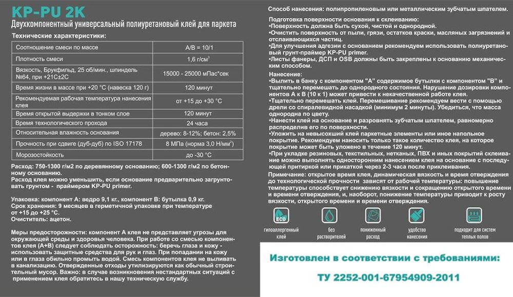 Полиуретановый клей KRAFT PARKETT KP-PU 2K / 10 кгДвухкомпонентный универсальный полиуретановый клей для паркета Характеристики: Общее соотношение смеси по своей массе составляет А/В = 10/1. Плотность составляет 1,6 кг./см. куб. Вязкость рассчитанная по Брукфильду, 25 оборотов в минуту: шпиндель номер 64, при темп. 21 гр. плюс/минус 2 град. 15000-25000 мПас/с. Время жизни в общей массе при темп. 20 град. (навеска 120 г.) составляет 120 мин. Рекомендуется наносить клей при показателях темп. от 15 до 30 град. Время прохода: 24 ч. Основание имеет относительную влажность: 8-12%, а бетон: 2,5%. Прочность (дуб/дуб) измеренная по ISO 17178 составляет 8 МПа. (стандарт 3 Н/кв. мм). Показатели устойчивости к холоду: до минус 30 град. Расход клея при использовании составляет значение от 750 до 1300 гр. по дереву, по бетону и стяжке от 900 до 1500 гр. Внимание! Расход имеется возможность заметно снизить, если основание качественно загрунтовать с использованием праймером марки KP-PU PRIMER. Срок хранения клея составляет 9 мес., в герметичной таре при показателях темпер. 15-30 град. Меры предосторожности при использовании клея: При использовании необходимо следовать мерам осторожности и тщательно беречь глаза, а также кожу. Необходимо применять специализированные средства защиты. Если клей попала на кожу и глаза, следует незамедлительно промыть водой. Особенности нанесения: Клей необходимо наносить при использовании зубчатого или же полипропиленового вида шпателя. Особенности подготовки: Вытираем поверхность насухо и удаляем грязь. Чтобы улучшить показатели адгезии, рекомендуется применять грунт-праймер марки KP-PU PRIMER. Нанесение: Вылить содержимое компонента "А" в банку, где находится компонент "В" и перемешать, пока не получится однородная масса. Не рекомендуется нарушать дозировку компонентов, потому как это приведет к снижению качества клея. Наносите клей на основание и равномерно располагаете его. Следует наносить такое количество клея, чтобы поверхность могла высохнуть за 120 мин. При осуществлении укладки клея на резиновых, а также нетканых, текстильных и ПВХ поверхностях, имеется возможность выполнять склеивание с последующей протиркой, что более эффективно и надежно при использовании. Выгодно приобрести Купить клей KRAFT PARKETT KP-PU 2K / 10 кг, который отличается высоким качеством и эффективностью при использовании. Закажите с бесплатной доставкой, и мы предоставим хорошую скидку до 15 процентов. Дополнительно в подарок инструмент для нанесения - зубчатый шпатель. |