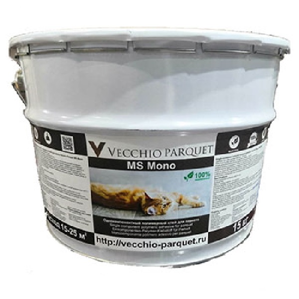 Клей Vecchio Parquet MS Mono 15 кгКлей Vecchio Parquet MS Mono российского производства — это высококачественный однокомпонентный полимерный клей, специально разработанный для укладки паркета. Упаковка 15 кг идеально подходит как для профессиональных мастеров, так и для домашних мастеров, обеспечивая надежное и долговечное сцепление. Преимущества: - Универсальность: Подходит для всех видов деревянных покрытий, включая массивную доску и инженерный паркет.