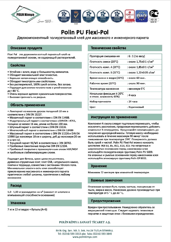 Двухкомпонентный эластичный полиуретановый клей для паркета Polin 2K PU Flexi-Pol (Турция-Германия)