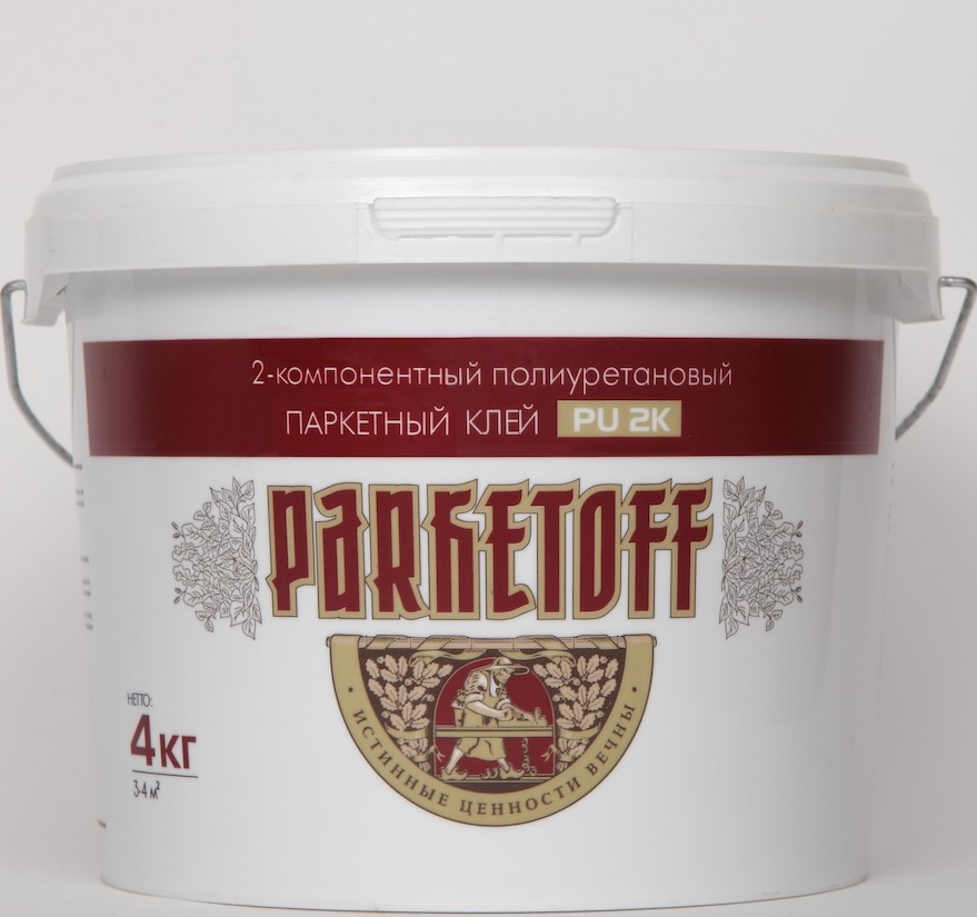 Клей Parketoff PU 2K / 4 кгДвухкомпонентный паркетный полиуретановый клей Parketoff PU 2K/4 Описание: Высококачественный двухкомпонентный паркетный клей для укладки различных видов паркета: штучного, художественного, щитового, паркетной и массивной доски - на гигроскопичные (цементные, бетонные, ангидритовые и т.п.) и негигроскопичные основания (керамическая плитка, каменные и металлические основания). Двухкомпонентный клей - это незаменимая вещь при укладке напольных покрытий. Свойства: Высокая прочность клеевого шва: не содержит воды и растворителей, подходит для укладки паркета в помещениях с высокой нагрузкой, а так же на пол с обогревом; удовлетворяет всем требованиям DIN 281. обладает хорошей текучестью, высокими проникающими свойствами. Подходит для полов с подогревом и помещений с высокой нагрузкой. Условия нанесения: Двухкомпонентный клей не рекомендуется применять при температуре воздуха ниже 15°С и относительной влажности воздуха выше 65%. В холодное время года клей и паркет необходимо заблаговременно занести в помещение, в котором будут производиться работы, и дать отлежаться, пока они не нагреются до комнатной температуры. Подготовка поверхности: Основание должно быть прочным и ровным, без трещин, предварительно очищенным от пыли, масел, жира и других возможных загрязнений; должно соответствовать всем нормам стандарта DIN 281. Щели и трещины на стяжках при необходимости должны быть обработаны ремонтной пастой. Цементные, ангидритовые основания и полы с обогревом должны быть предварительно обработаны грунтовкой PARKETOFF PU PRIMER 1K. Применение: Отвердитель (компонент В) добавить в емкость с компонентом А в соотношении, зависимо от веса. Оба компонента хорошо перемешивают примерно 3 мин. при помощи ручной дрели с насадкой для смешивания до получения однородной массы. Затем смесь наносят на предварительно подготовленное основание (не более 1 м2) при помощи зубчатого щпателя. После этого сразу укладывают паркет, подбивая и хорошо прижимая плашки. ВНИМАНИЕ! Обратная сторона плашек должна быть полностью обработана клеем. Учитывая возможную деформацию паркета, между стеной и укладкой обязательно оставляют зазор в 1-2 см. Шлифовать и покрывать лаком паркет можно только через 24 часа после укладки. Технические данные:
