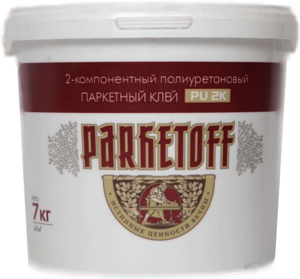 Клей Parketoff PU 2K / 7 кгДвухкомпонентный паркетный полиуретановый клей Parketoff PU 2K/7 Описание: Высококачественный двухкомпонентный паркетный клей для укладки различных видов паркета: штучного, художественного, щитового, паркетной и массивной доски - на гигроскопичные (цементные, бетонные, ангидритовые и т.п.) и негигроскопичные основания (керамическая плитка, каменные и металлические основания). Двухкомпонентный клей - это незаменимая вещь при укладке напольных покрытий. Свойства: Высокая прочность клеевого шва: не содержит воды и растворителей, подходит для укладки паркета в помещениях с высокой нагрузкой, а так же на пол с обогревом; удовлетворяет всем требованиям DIN 281. обладает хорошей текучестью, высокими проникающими свойствами. Подходит для полов с подогревом и помещений с высокой нагрузкой. Условия нанесения: Двухкомпонентный клей не рекомендуется применять при температуре воздуха ниже 15°С и относительной влажности воздуха выше 65%. В холодное время года клей и паркет необходимо заблаговременно занести в помещение, в котором будут производиться работы, и дать отлежаться, пока они не нагреются до комнатной температуры. Подготовка поверхности: Основание должно быть прочным и ровным, без трещин, предварительно очищенным от пыли, масел, жира и других возможных загрязнений; должно соответствовать всем нормам стандарта DIN 281. Щели и трещины на стяжках при необходимости должны быть обработаны ремонтной пастой. Цементные, ангидритовые основания и полы с обогревом должны быть предварительно обработаны грунтовкой PARKETOFF PU PRIMER 1K. Применение: Отвердитель (компонент В) добавить в емкость с компонентом А в соотношении, зависимо от веса. Оба компонента хорошо перемешивают примерно 3 мин. при помощи ручной дрели с насадкой для смешивания до получения однородной массы. Затем смесь наносят на предварительно подготовленное основание (не более 1 м2) при помощи зубчатого щпателя. После этого сразу укладывают паркет, подбивая и хорошо прижимая плашки. ВНИМАНИЕ! Обратная сторона плашек должна быть полностью обработана клеем. Учитывая возможную деформацию паркета, между стеной и укладкой обязательно оставляют зазор в 1-2 см. Шлифовать и покрывать лаком паркет можно только через 24 часа после укладки. Технические данные: