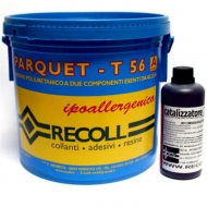 Клей Recoll Parquet T56 / 10 кгУниверсальный клей Recoll Parquet T56 (масса: 9,2 кг + отвердитель: 0,8 кг) Продукт не содержит воды, идеально совместим со всеми существующими на сегодняшний день разновидностями паркетов. Легко ложится как на цементное основание, так и на непористые полы, к примеру: мрамор, плитка, мозаичный пол и настил из древесины. Не пахнет. ОСНОВАНИЕ: ПОДГОТОВКА ПОКРЫТИЯ ДЛЯ РАБОТЫ 1. Первое, что следует сделать - проверить наличие и уровень воды в покрытии, задействовав для этого специальный инструмент (<2%). 2. Измерение выполнить на глубине (ок. 2-3 см), использовав при этом гигрометр с ампулой с карбидом (дабы исключить наличие гигроскопических примесей. 3. Запрещено использовать его на тех основаниях, которые не защищены от вероятного попадания влаги. 4. В том случае, когда цементные стяжки являются не очень устойчивыми или же пылят, то их следует укрепить такими смесями, как: PRIMER PU, POLY ECO или PS39). Благодаря им клей засохнет гораздо лучше.