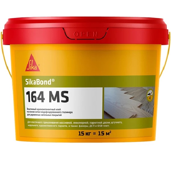 Клей Sika Bond-164 MS / 15 кгSikaBond-164 MS (7,5+7,5=15 кг) представляет собой однокомпонентный, не содержащий растворителей и воды клей для деревянных полов на основе силан-модифицированного полимера (SMP). Применение - Для приклеивания по всей поверхности.