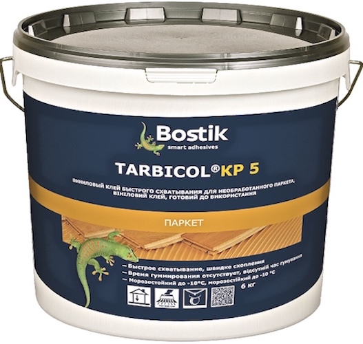 Клей Bostik TARBICOL KP5 / 6 кгВиниловый клей для паркета и фанеры на водной основе Однокомпонентный дисперсионный клей для укладки паркета. Предназначен для укладки необработанного мозаичного, торцевого и штучного паркета (шпунтованного и нешпунтованного) с низкой чувствительностью к влаге и толщиной до 15 мм, для приклеивания пробковой подложки, а также фанеры, ДСП, ДВП, OSB методом сплошного нанесения. Наносится на впитывающее минеральное или прочно зафиксированное деревянное основание ( в т.ч. цементное, ангидридное, фанеру, ДСП, ДВП, OSB). Не подходит для укладки лакированного заводским способом паркета.